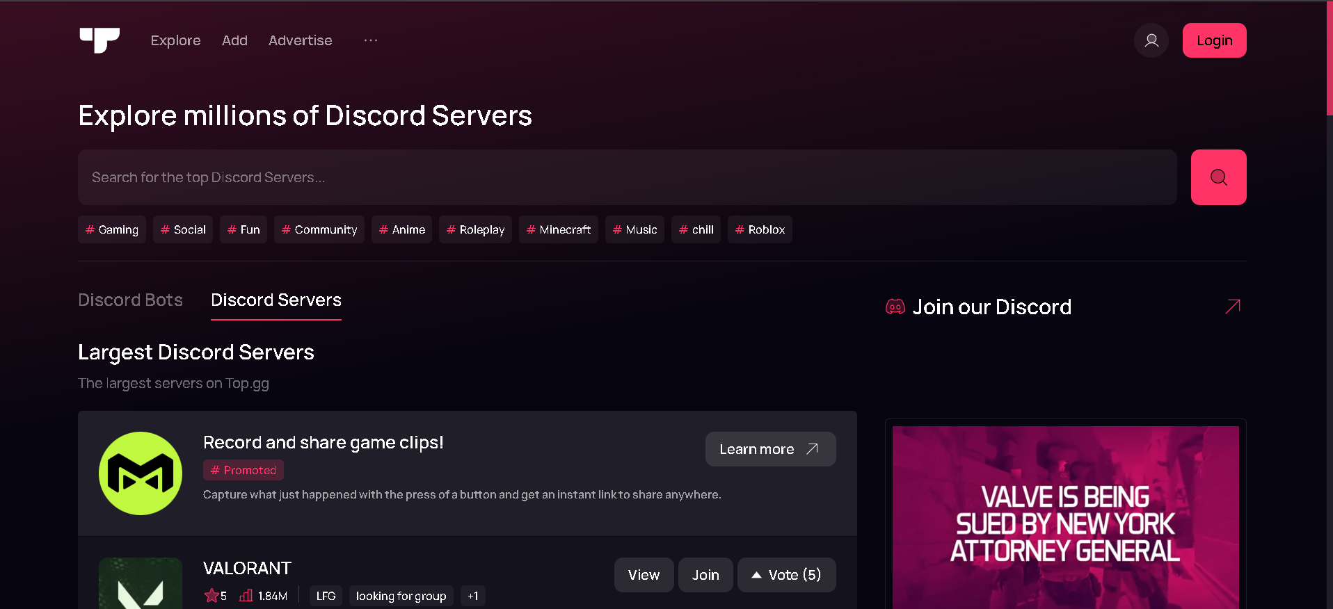 More than just a server directory, Top.gg is a massive hub for both Discord servers and bots.